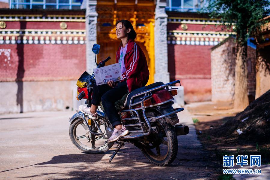 9月14日,在青海省化隆回族自治县金源藏族乡科上村,李毛卓玛展示自己的大学录取通知书。