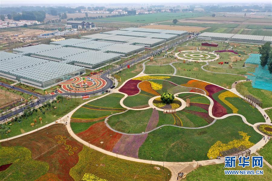 这是9月21日拍摄的西姜寨爱思嘉现代农业产业园里由菊花组成的图案及温室大棚(无人机照片)。 9月22日,我国将迎来第三个中国农民丰收节。作为2020年中国农民丰收节河南省主会场所在地,开封市祥符区西姜寨爱思嘉现代农业产业园装点一新,庆祝农民丰收节的到来。 新华社记者 冯大鹏 摄