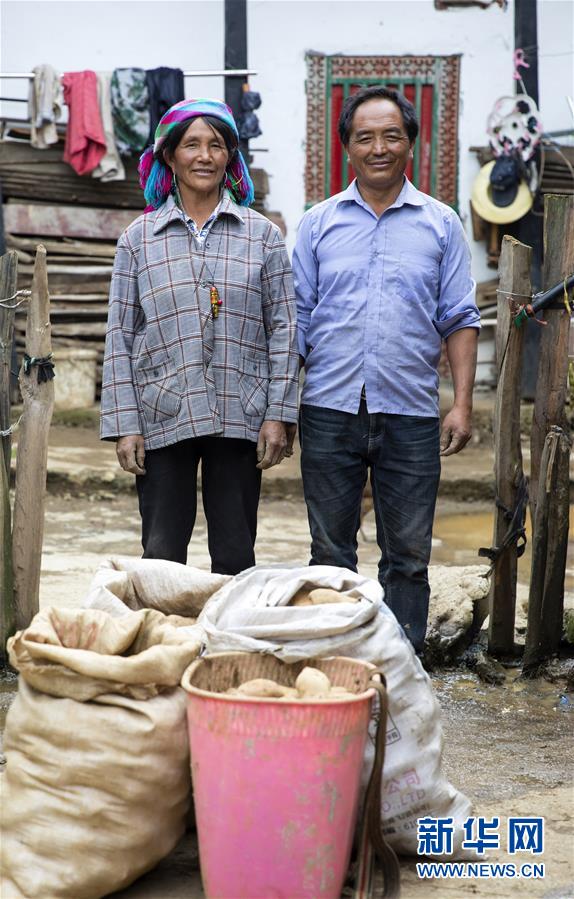 在四川省凉山彝族自治州金阳县甲依乡拉木觉村,彝族妇人曲么木土火和丈夫赵早日在旧居前展示要拿去金阳县城出售的土豆(9月5日摄)。新华社记者 沈伯韩 摄