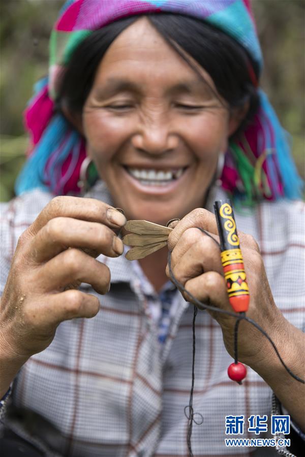 在四川省凉山彝族自治州金阳县甲依乡拉木觉村,彝族妇人曲么木土火在田里劳作的间隙,拨弄着陪伴她多年的口弦(9月5日摄)。新华社记者 沈伯韩 摄