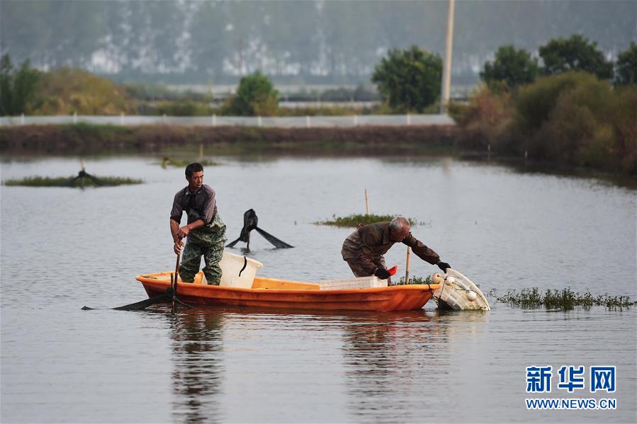 9月23日,在五河县沱湖乡大岗村螃蟹养殖基地,当地农户在捕捞螃蟹。 近年来,安徽省五河县沱湖乡依托当地农业资源优势,建设特色养殖基地,采取“龙头公司+合作社+农户”的形式,发展小龙虾、螃蟹等特色养殖,通过土地流转、资金入股、劳务增收等形式带动贫困户脱贫增收。 新华社记者 黄博涵 摄