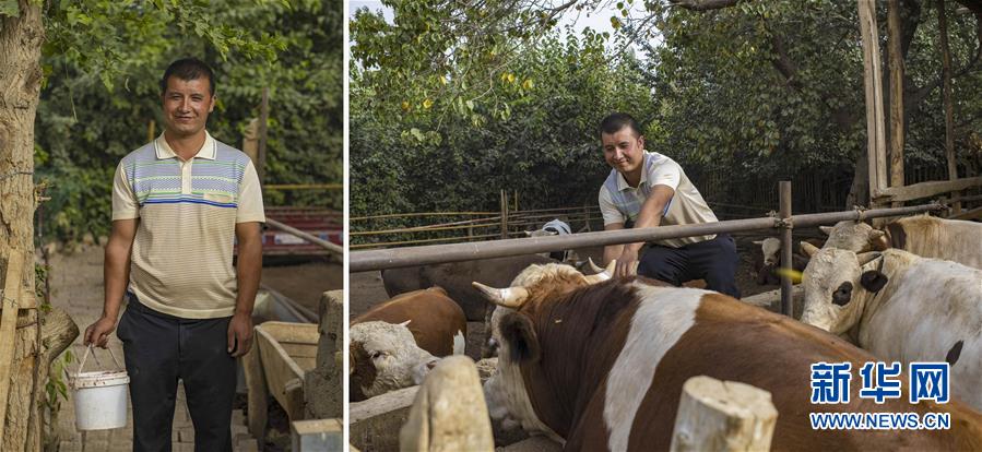 拼版照片:左图为新疆和田地区策勒县策勒乡托帕艾日克村民肉孜买买提·吐地尼亚则;右图为肉孜买买提在托帕艾日克村牛养殖区给牛群喂食(9月19日摄)。自2017年起,该村利用小额贷款政策支持,规模化发展养殖业,打造生态“牛村”。新华社记者 胡虎虎 摄