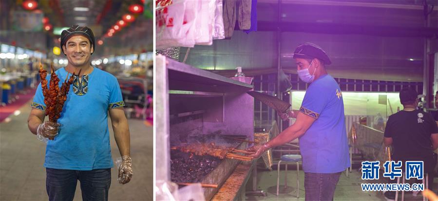 拼版照片:左图是在新疆和田地区和田夜市摊主买托合提·艾则孜;右图为买托合提在和田夜市为顾客烤制红柳烤肉(9月21日摄)。和田夜市为贫困户提供专门经营摊位,并采取租金减免等优惠政策。买托合提家一度因病致贫,经过努力,已于2019年脱贫。胡虎虎 摄