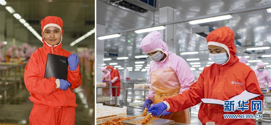 拼版照片:左图为新疆和田地区墨玉县阿克萨拉依乡村民布麦热姆·阿卜杜阿帕尔,她是当地一家食品企业生产车间的小组长;右图为布麦热姆(右)在食品生产车间检查单个肉串重量是否符合标准(9月23日摄)。22岁的布麦热姆毕业于墨玉县职业技术高中学校,她家已于2019年实现脱贫。新华社记者 胡虎虎 摄