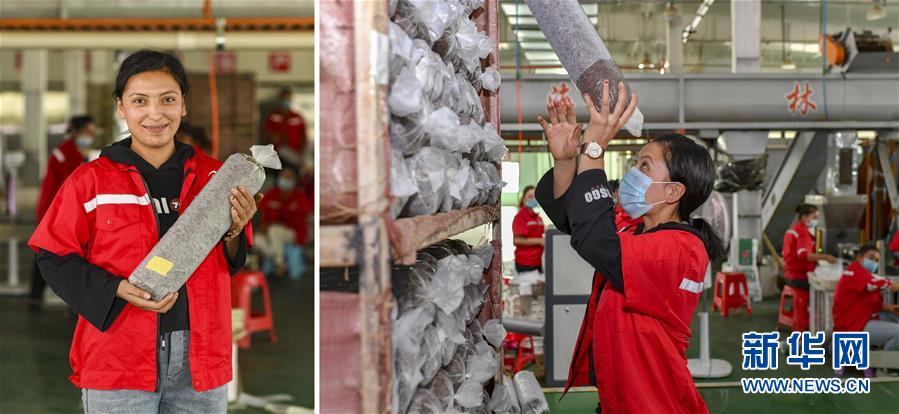 拼版照片:左图为新疆和田地区墨玉县萨依巴格乡村民阿孜古丽·阿卜力提甫;右图为阿孜古丽在墨玉县一家菌业公司的菌种装袋车间工作(9月23日摄)。2019年10月,阿孜古丽来到这里上班,她家已经实现脱贫。新华社记者 胡虎虎 摄
