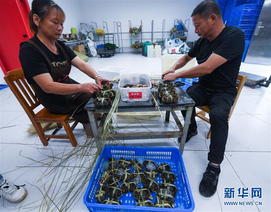 9月23日,在杨溇村“杨桂珍”太湖蟹养殖基地,养殖户用马莲草捆扎收获的太湖蟹,并根据蟹的不同重量挂上相应的防伪标志牌。新华社记者 徐昱 摄