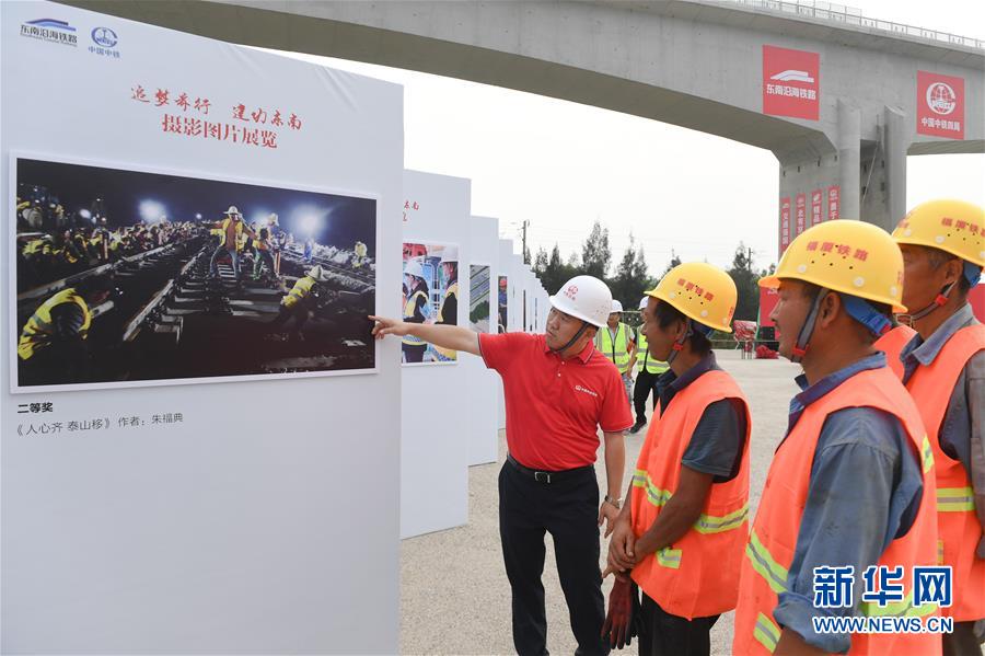 9月23日,在中铁四局新建福厦铁路8标段工地,一名参展者向工友介绍摄影作品。 当日,一场由高铁一线建设者参与拍摄、布展的工地摄影展,在中铁四局新建福厦铁路8标段工地上举行。摄影展主要展现新建福厦铁路建设进展和建设者风采,照片均由一线工人、工程师、技术员等拍摄。 新建福厦铁路是国家“一带一路”建设重点工程,设计时速350公里,预计2022年建成通车。 新华社记者 宋为伟 摄