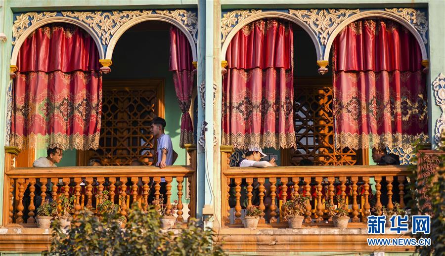9月22日,在喀什古城景区,游客在“百年茶馆”里品茶休息。新华社记者 赵戈 摄