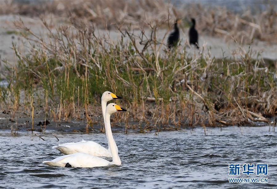 9月23日,两只白天鹅在乌伦古湖国家湿地公园觅食。 乌伦古湖国家湿地公园位于新疆阿勒泰地区福海县,是迁徙候鸟飞越天山和阿尔泰山的“能量补充站”。金秋时节,迁徙的候鸟会在此停留,成为湿地一道靓丽风景。近年来,随着阿勒泰地区生态环境不断改善,乌伦古湖湿地公园各类候鸟数量不断增加。 新华社记者 沙达提 摄