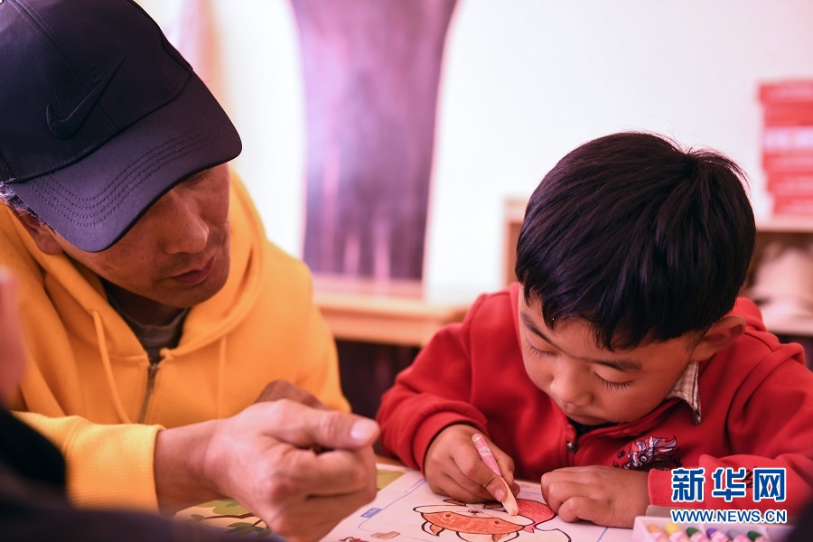 9月17日,青海省果洛藏族自治州玛沁县拉加镇中心幼儿园的老师辅导孩子们上美术课。(新华网潘彬彬 摄)