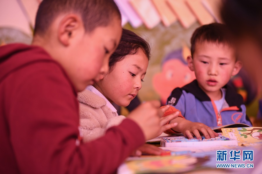 9月17日,在青海省果洛藏族自治州玛沁县拉加镇中心幼儿园,孩子们正在专心上美术课。(新华网潘彬彬 摄)