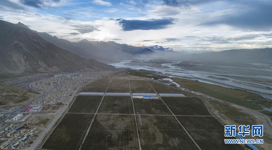 位于山南市贡嘎县森布日村的矮化苹果种植园,其左侧为安置点民居,右侧为雅鲁藏布江(9月23日摄,无人机照片)。金秋丰收季,在西藏山南市贡嘎县森布日村,森布日搬迁安置点附近的千亩矮化苹果种植园迎来丰收。森布日搬迁安置点是西藏极高海拔地区居民生态搬迁安置点之一。2018年6月,西藏开始实施极高海拔生态搬迁项目。2019年底,来自那曲市安多县色务乡,双湖县嘎措乡、雅曲乡、措折强玛乡的共计957户、4058名群众搬迁至此。 矮化苹果种植园是山南市森布日极高海拔生态搬迁点经济林种植基地建设项目的一部分,目前委托给西藏康其农业发展有限公司管理运营。果园收入的65%将作为分红交给搬迁群众。 新华社记者 孙非 摄