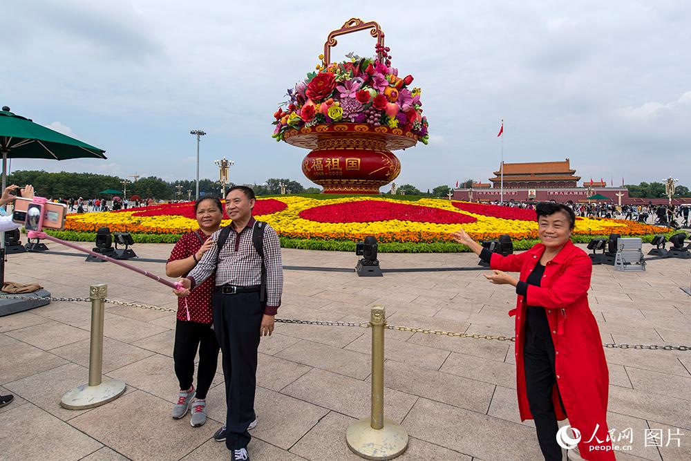 9月24日,在北京天安门广场,游客纷纷与“祝福祖国”主题花篮合影留念。据了解,花篮两侧书写着“祝福祖国”及“万众一心”字样,篮内摆放全国各省份代表花卉及富有吉祥寓意的果实。人民网记者 翁奇羽 摄