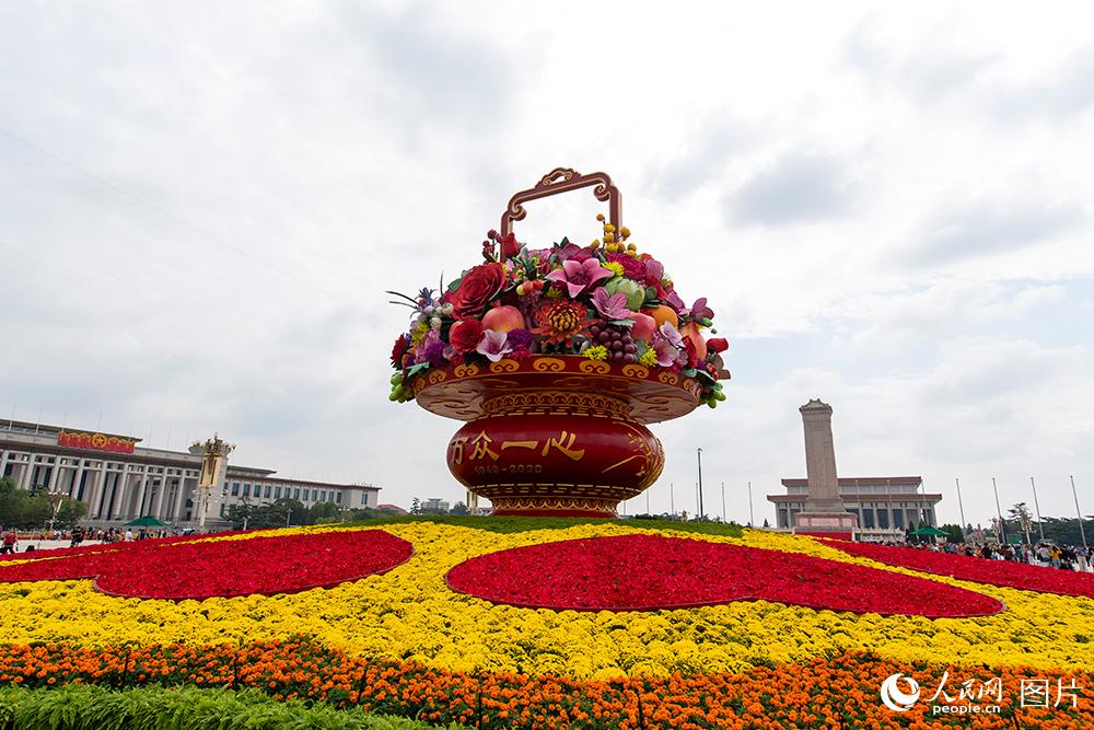 “祝福祖国”主题花篮亮相天安门广场。人民网记者 翁奇羽 摄