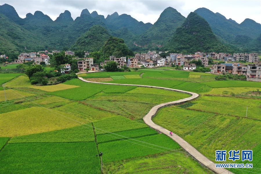 这是广西平乐县张家镇田园风光(9月24日摄,无人机照片)。 广西平乐县张家镇在稳定水稻播种面积的同时,积极推广优质高产水稻新品种。时下,正值该镇晚稻抽穗扬花时节,田园一派美丽景象。 新华社记者 周华 摄