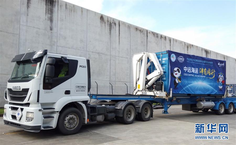 在新西兰最大城市奥克兰,由中远海运集运(新西兰)有限公司承运的第三届进博会新西兰展品装车待发(9月18日摄)。 乳制品、保健品、蜂蜜制品、冰激凌……带有新西兰特色的商品24日从该国最大城市奥克兰集装箱码头装船出发,运往第三届中国国际进口博览会现场。 新华社发