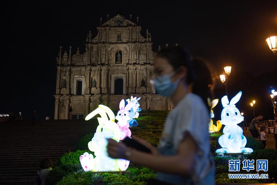 9月25日拍摄的澳门大三巴牌坊前的中秋灯饰。 国庆及中秋将至,澳门各主要街道、广场、公园及建筑物上布置了节日灯饰,佳节气氛浓厚。 新华社记者 张金加 摄