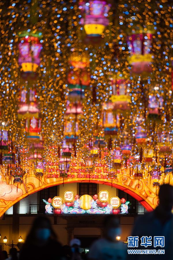 9月25日,市民在澳门议事亭前地欣赏节日灯饰。 国庆及中秋将至,澳门各主要街道、广场、公园及建筑物上布置了节日灯饰,佳节气氛浓厚。 新华社记者 张金加 摄