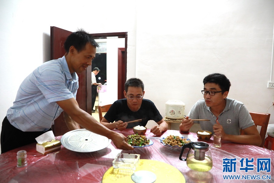 图为唐彦忠正在给前来用餐的游客上菜。新华网 王凯丰 摄
