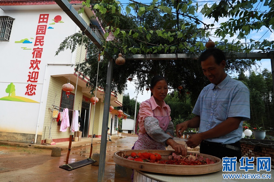 10年前,面朝大山,唐彦忠选择离开家乡外出打拼。2019年9月,当家乡的上堡梯田景区竣工营业后,唐彦忠和妻子决定回到家乡。图为唐彦忠和妻子江春华正在自家院子里晾晒干货。新华网 王凯丰 摄
