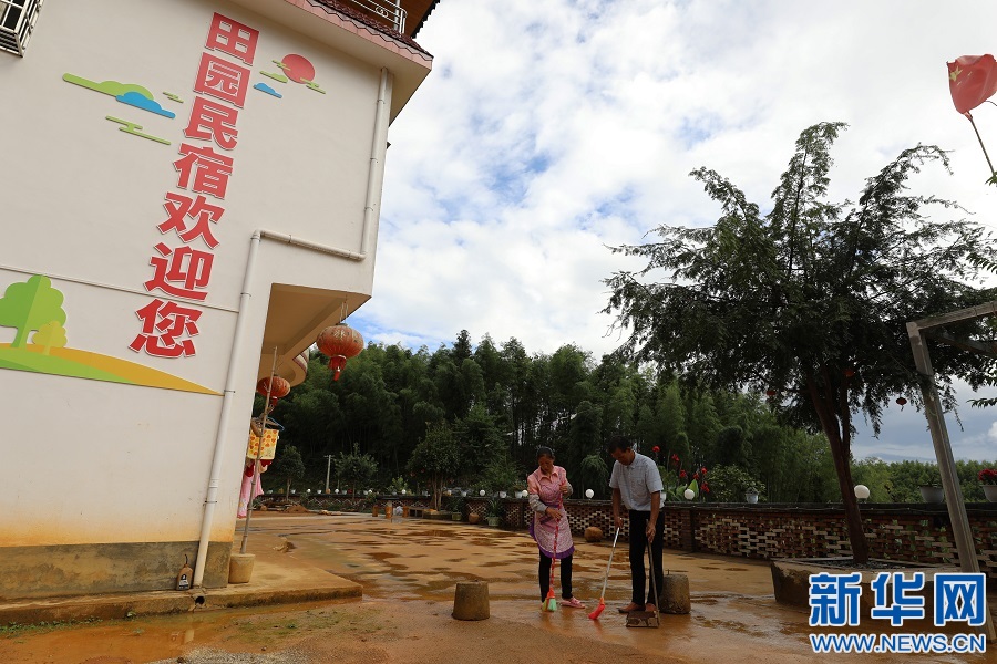 结合自家位置特点,唐彦忠和妻子把位于半山腰的房屋改建成民宿,决心留下来,告别过去在外漂泊的日子。图为唐彦忠和妻子江春华正在自家院子前打扫卫生。新华网 王凯丰 摄