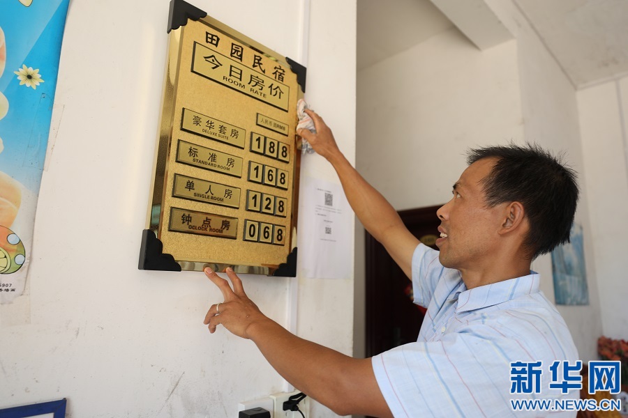 随着国庆中秋假期的临近,目前唐彦忠已经收到了不少游客的房间预订。图为唐彦忠正在更新当日民宿的房价。新华网 王凯丰 摄