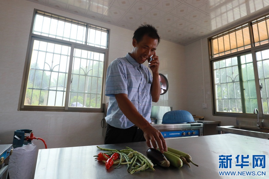 除了经营民宿外,唐彦忠还积极发展农家乐,凭着妻子江春华的好厨艺,民宿的农家菜广受好评。图为唐春华接到游客订餐电话,正在沟通菜单。新华网 王凯丰 摄