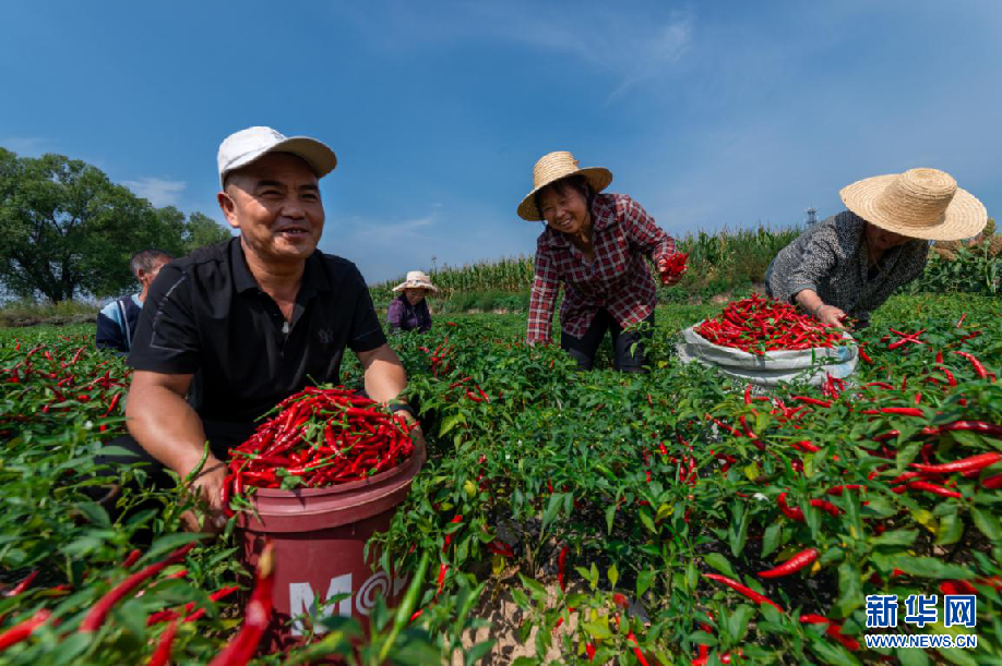 山西长治襄垣县王村镇龙王堂村的田间地头,到处一派繁忙景象,当地百姓正在辣椒基地采摘辣椒。新华网 发(赵志强 摄)