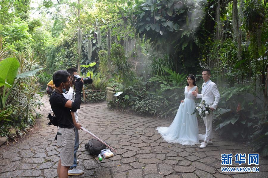 9月26日,两名年轻人在厦门市园林植物园拍婚纱照。