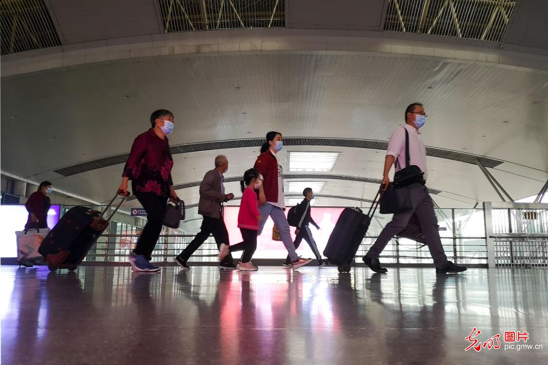 2020年9月26日,乘客们在武昌火车站匆忙前行。当日,湖北省武昌火车站迎来国庆节、中秋节来临前的小高峰,站台与过道,都是匆匆回家团圆或外出旅行的乘客。(胡学军摄/光明图片)