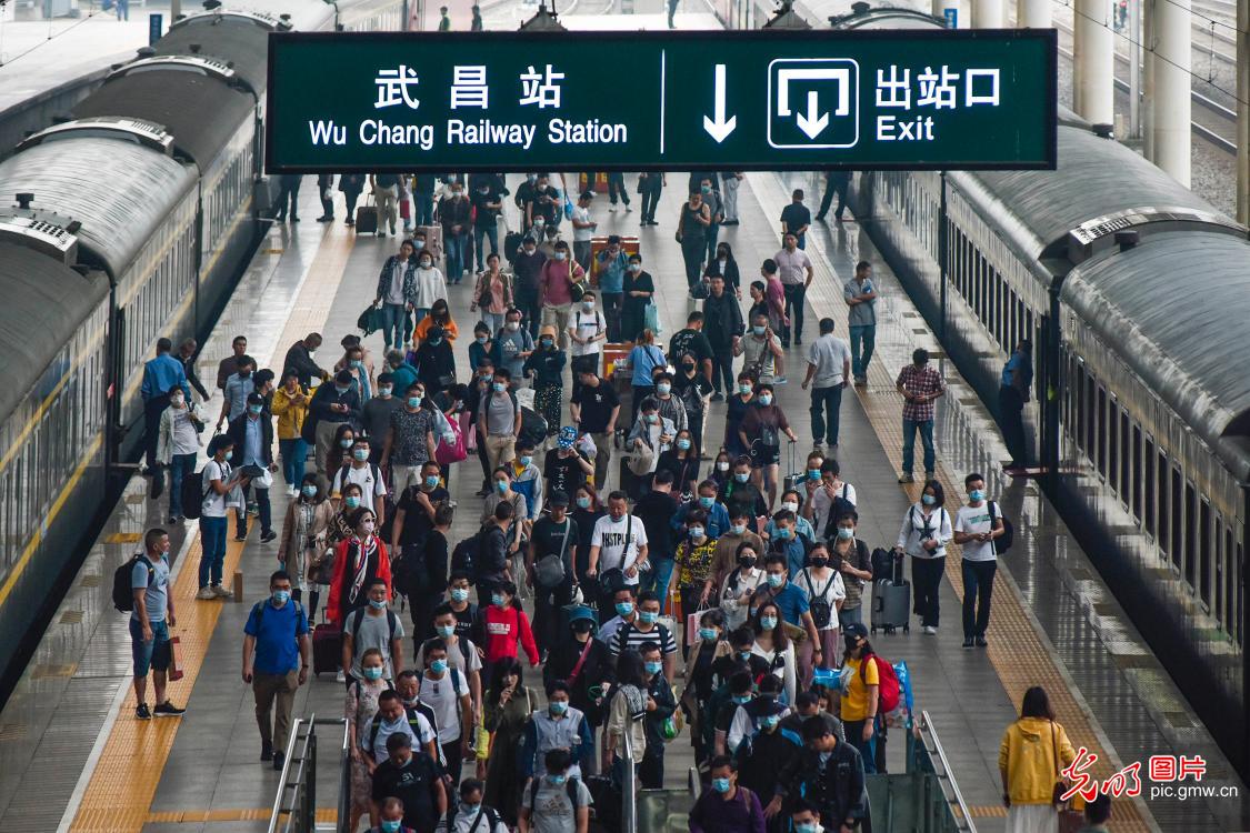 2020年9月26日,人流如织的武昌火车站站台。当日,湖北省武昌火车站迎来国庆节、中秋节来临前的小高峰,站台与过道,都是匆匆回家团圆或外出旅行的乘客。(胡学军摄/光明图片)