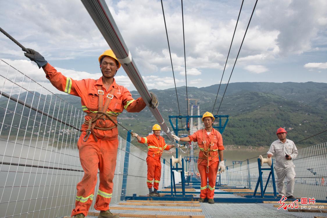 2020年9月24日,重庆万州新田长江大桥北岸主塔上首根主缆索股随着拽拉器的牵引以每分钟20米的速度向南岸主塔缓缓"过江",标志着新田长江大桥进入主缆架设施工阶段,全面转入上部主体施工。图为工人稳住索股,平稳搁置到支架上。(刘兴敏摄/光明图片)