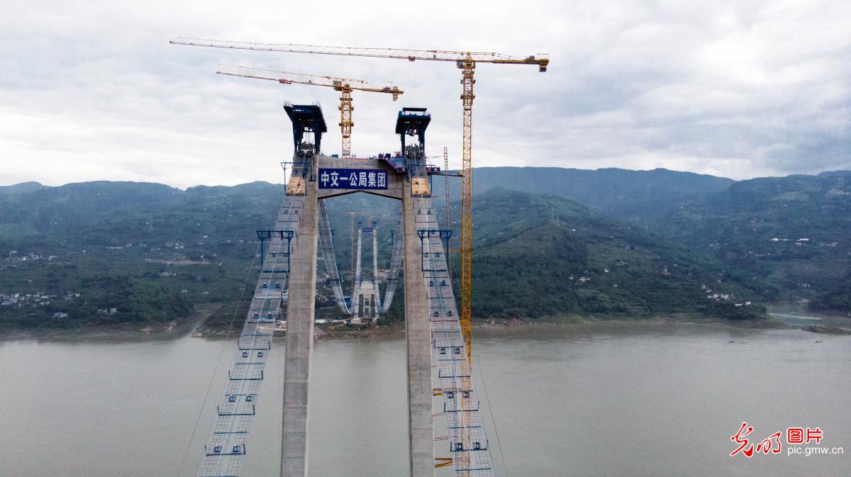 2020年9月24日,重庆万州新田长江大桥北岸主塔上首根主缆索股随着拽拉器的牵引以每分钟20米的速度向南岸主塔缓缓"过江",标志着新田长江大桥进入主缆架设施工阶段,全面转入上部主体施工。图为主缆索股通过猫道由北岸缓缓向南岸移动。(刘兴敏摄/光明图片)