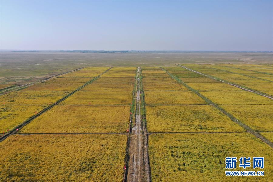这是9月27日拍摄的位于科尔沁右翼中旗的兴安盟袁隆平院士工作站盐碱地水稻基地(无人机照片)。 当日,位于内蒙古自治区兴安盟科尔沁右翼中旗的兴安盟袁隆平院士工作站盐碱地水稻基地传来好消息,经测产评估,耐盐碱水稻(海水稻)平均亩产稻谷再破千斤。 据了解,该基地耐盐碱水稻连续两年亩产破千斤,不仅为兴安盟盐碱中低产田提升为中高产田注入希望,更为我国同等条件下的盐碱地水稻种植提供了科学依据。 新华社记者 徐钦 摄