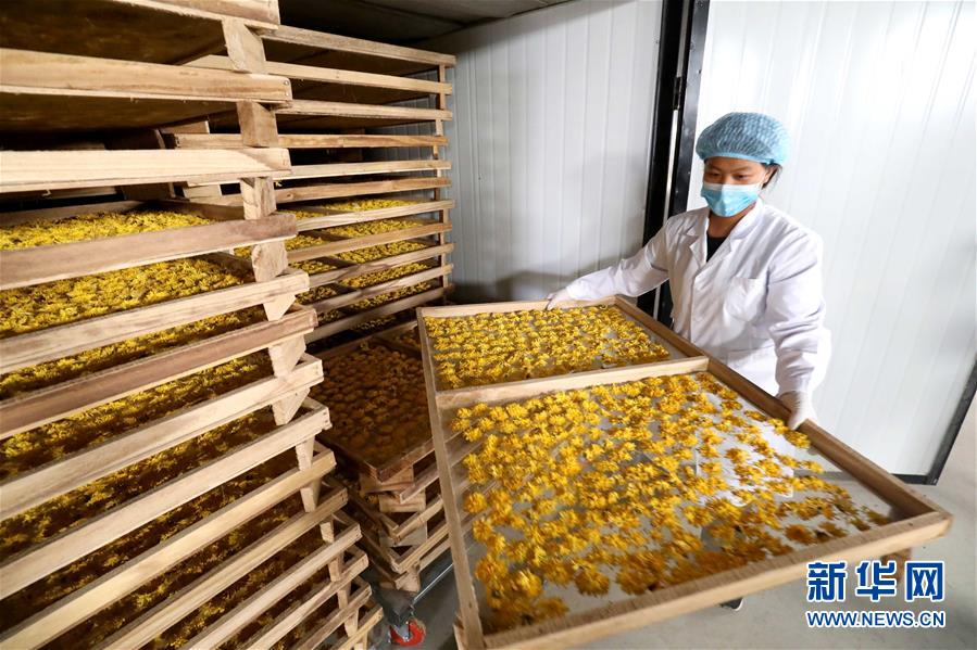 9月28日,在石家庄市行唐县南桥镇沙河水乡现代农业园区,农户在进行皇菊花烘干作业。新华社发(梁子栋 摄)
