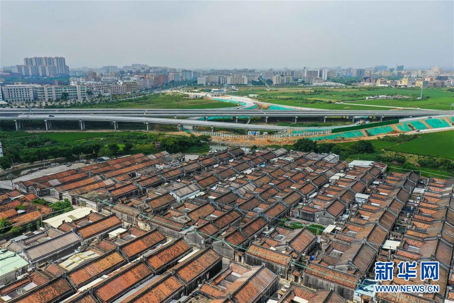 现代化的汕揭高速北环大道高架桥与古老的潮汕传统民居(9月29日摄,无人机照片)。 由中铁八局三公司负责施工的汕揭高速(汕头到揭西)将于年底前全线通车。全长86.5公里的汕揭高速公路位于广东省规划的“九纵五横两环”高速公路网中横贯东西的汕湛(汕头至湛江)高速公路东段,该通道较目前深汕高速公路营运里程要短,能进一步缩短粤东地区同粤港澳大湾区的距离,对加强粤东和大湾区经济联系将发挥重要作用。 新华社记者 刘大伟 摄