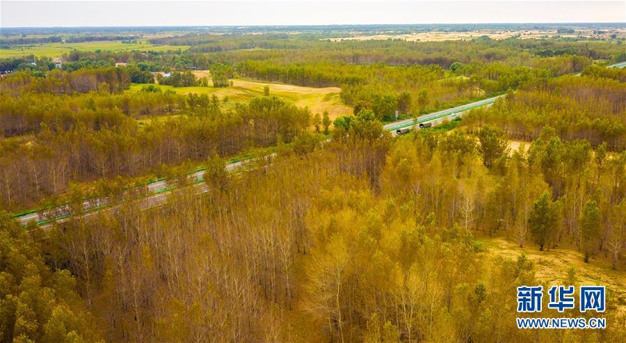 这是内蒙古通辽市科尔沁左翼后旗茂道吐苏木周边的科尔沁沙地的治理情况(9月14日摄,无人机照片)。新华社记者 彭源 摄