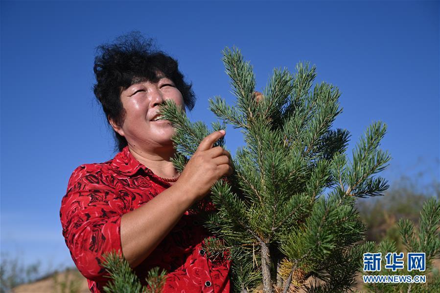 9月16日,殷玉珍在查看一棵樟子松长势。新华社记者 连振 摄