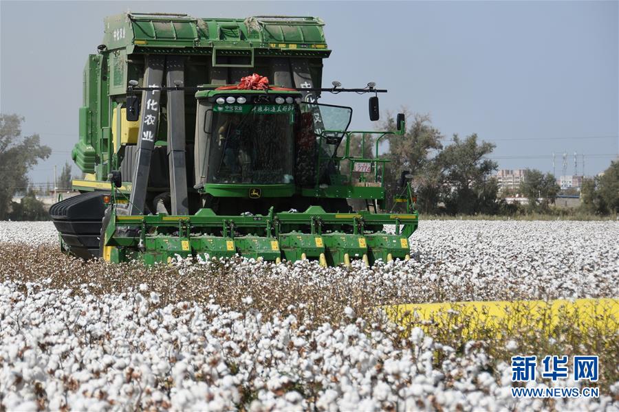 在新疆产棉大县尉犁县,工人驾驶采棉机采收棉花(9月23日摄)。 新华社记者 李志浩 摄