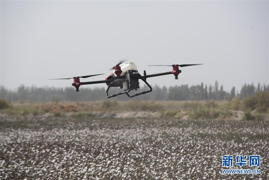 在新疆产棉大县尉犁县,一台农业植保无人机在为棉田喷施脱叶剂(9月23日摄)。 新华社记者 李志浩 摄