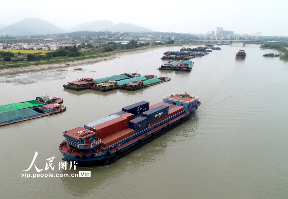 2020年9月29日,在安徽省巢湖市境内,满载货物的运输船队在合裕线航道裕溪河段有序航行,一派繁忙景象。