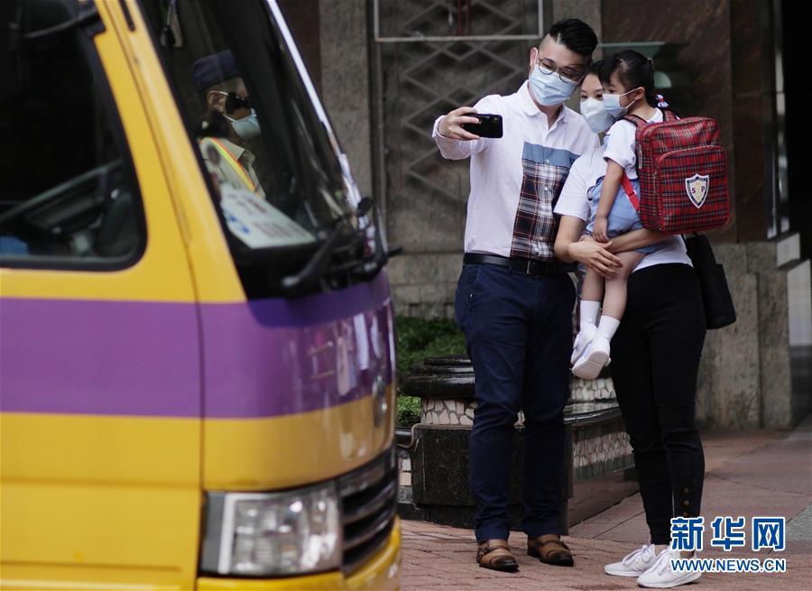 9月29日,在香港红磡,家长在和准备坐校车上学的孩子合影。新华社记者 王申 摄