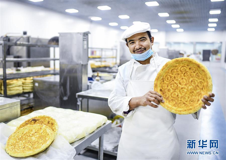 在乌鲁木齐产馕文化产业园,来自新疆喀什地区英吉沙县的阿卜都·萨拉木在加工车间展示自己烤制好的馕(2019年1月10日摄)。2018年,乌鲁木齐建成并投产馕文化产业园,从新疆南疆集中连片贫困地区转移的400余名富余劳动力在此就业。 近年来,随着一系列就业惠民工程深入实施,新疆越来越多的农村富余劳动力接受技能培训后实现有序进城就业。特别是第二次中央新疆工作座谈会以来,新增就业人数近200万。如今,有技能、有事干、有钱挣成为南疆一些深度贫困地区各族群众的生活“底色”。生活条件好起来,“钱袋子”鼓起来,对美好生活的希望更加迫切,当地群众劳动创业愿望越来越强烈,奋斗精神越来越足。 新华社记者 王菲 摄