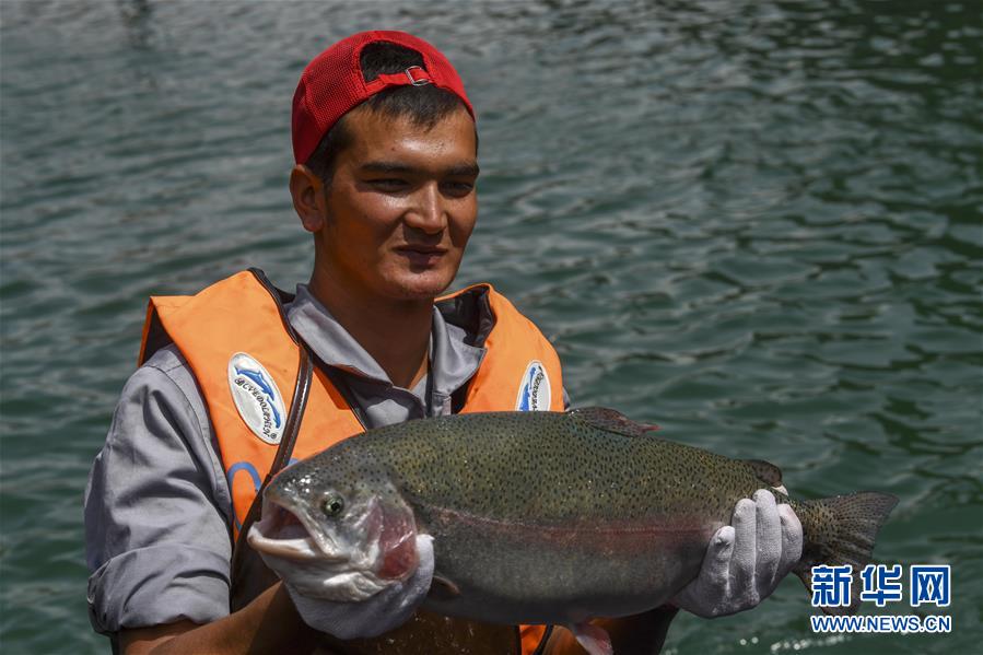 来自新疆和田地区皮山县的新疆天蕴有机农业有限公司员工艾克热木·米孜克热木展示刚捕捞上来的冷水鱼(6月17日摄)。这个公司位于新疆伊犁哈萨克自治州尼勒克县,已带动600多户贫困户成功脱贫。 近年来,随着一系列就业惠民工程深入实施,新疆越来越多的农村富余劳动力接受技能培训后实现有序进城就业。特别是第二次中央新疆工作座谈会以来,新增就业人数近200万。如今,有技能、有事干、有钱挣成为南疆一些深度贫困地区各族群众的生活“底色”。生活条件好起来,“钱袋子”鼓起来,对美好生活的希望更加迫切,当地群众劳动创业愿望越来越强烈,奋斗精神越来越足。 新华社记者 赵戈 摄