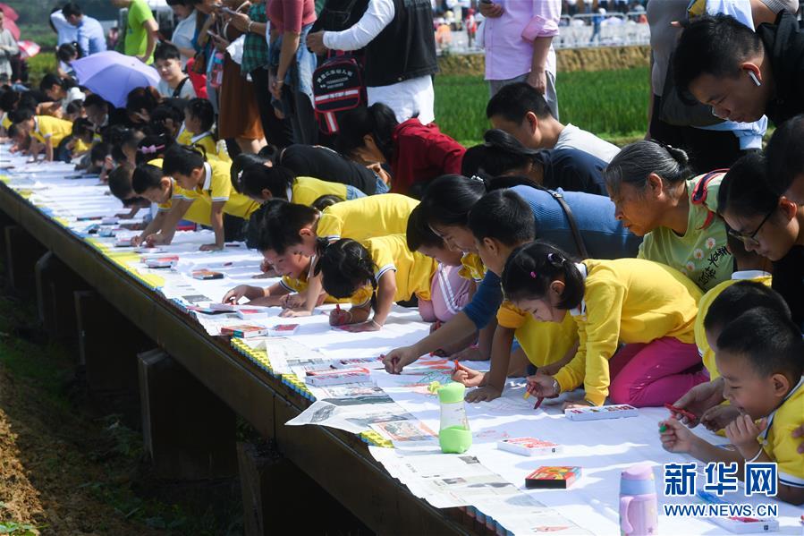 9月30日,孩子和家长在丰收节活动现场参加“手绘丰收”百米长卷绘画活动。 当日,浙江省义乌市佛堂镇龙溪村在万亩稻田中举办“庆丰收 迎国庆”丰收节活动。本次活动围绕“丰收有乐事”“丰收有看点”“丰收有味道”“丰收有逛头”四个板块开展。活动包括田园音乐会、农产品展销、美丽乡村广场舞大赛、村歌大赛、农田亲子趣味运动会、稻草人展示、原乡美食宴等内容。据介绍,丰收节已经成为当地展示乡村振兴成果、弘扬优秀农耕文化、拉动美丽乡村旅游和假期消费的重要节日。 新华社记者 徐昱 摄
