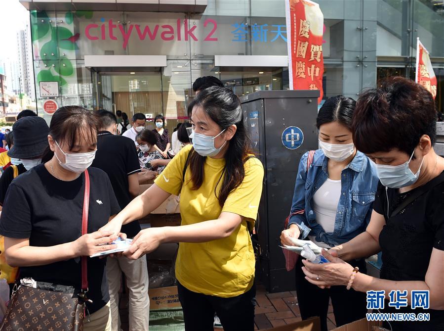 10月1日,工作人员向市民派发防疫用品。 当日,香港爱国爱港政团、社团在全港开设1000多个街站,向市民派发月饼、灯笼和防疫用品等,庆国庆,贺中秋。 新华社记者 卢炳辉 摄