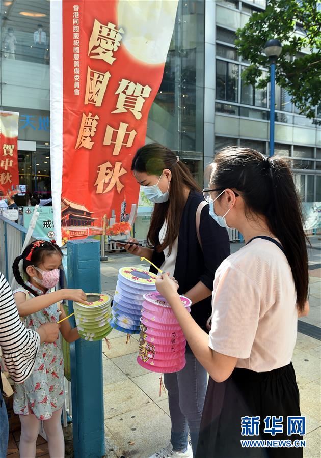10月1日,市民领取灯笼。 当日,香港爱国爱港政团、社团在全港开设1000多个街站,向市民派发月饼、灯笼和防疫用品等,庆国庆,贺中秋。 新华社记者 卢炳辉 摄