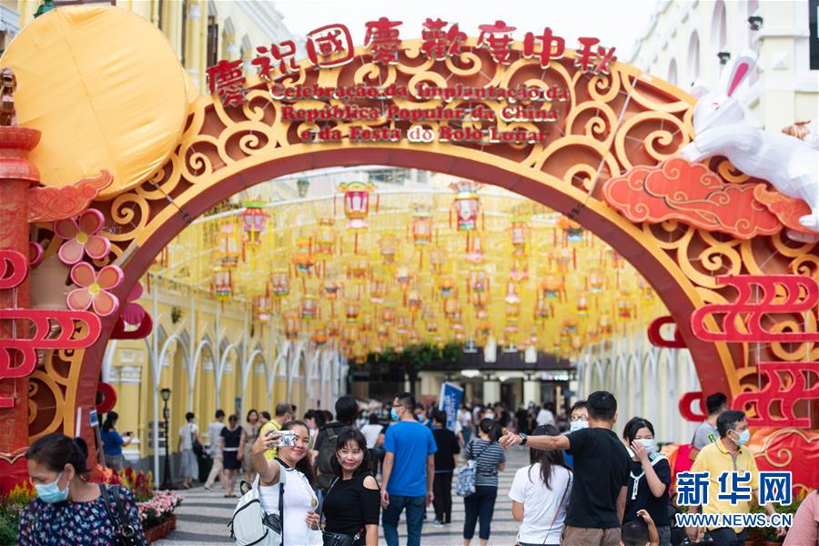 10月1日,人们在澳门议事亭前地游览。 当日是国庆节和中秋节,全国各地的人们用各种方式欢度节日。 新华社记者 张金加 摄