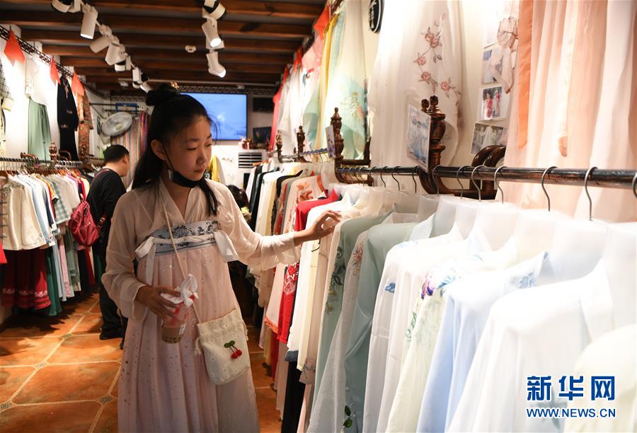 10月1日,游客在重庆磁器口古镇一汉服店内参观选购。 当日是国庆节和中秋节,全国各地的人们用各种方式欢度节日。 新华社记者 王全超 摄