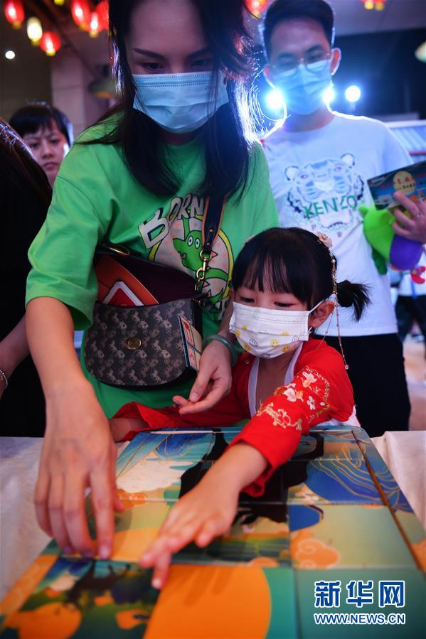 10月1日,小朋友和家长在位于海口市的海南省博物馆体验拼图游戏。 当日是国庆节和中秋节,全国各地的人们用各种方式欢度节日。 新华社记者 郭程 摄
